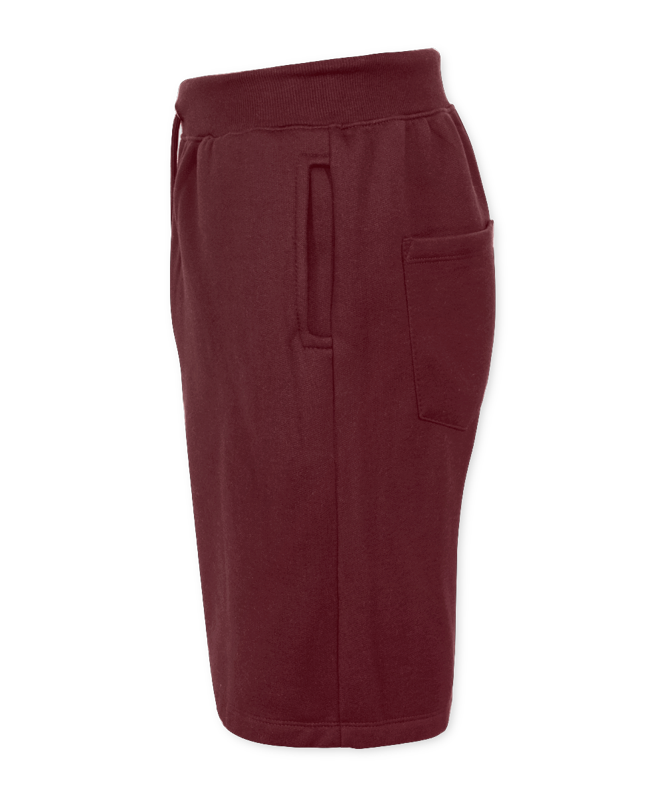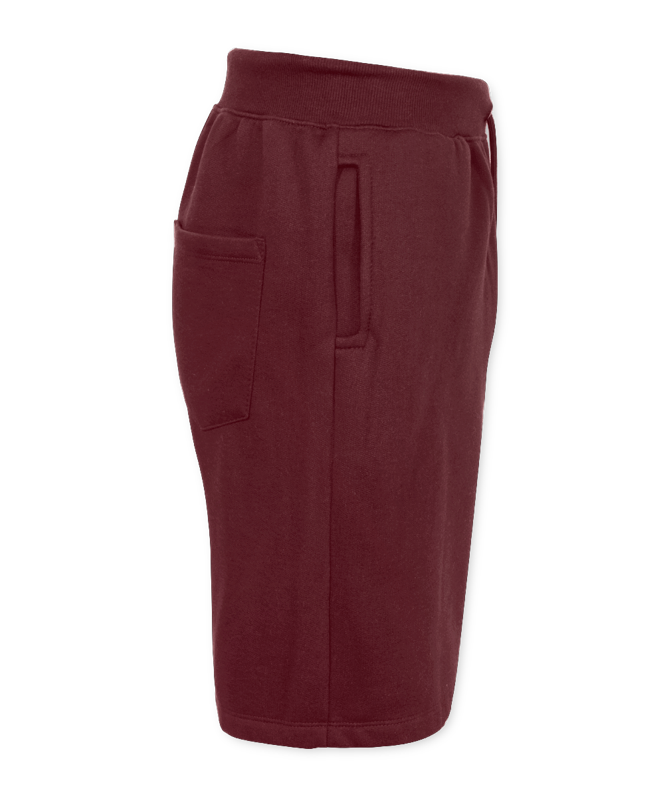 Bermuda de Moletom, na cor Bordô, com a escrita do Planeta da Criação pequena.
