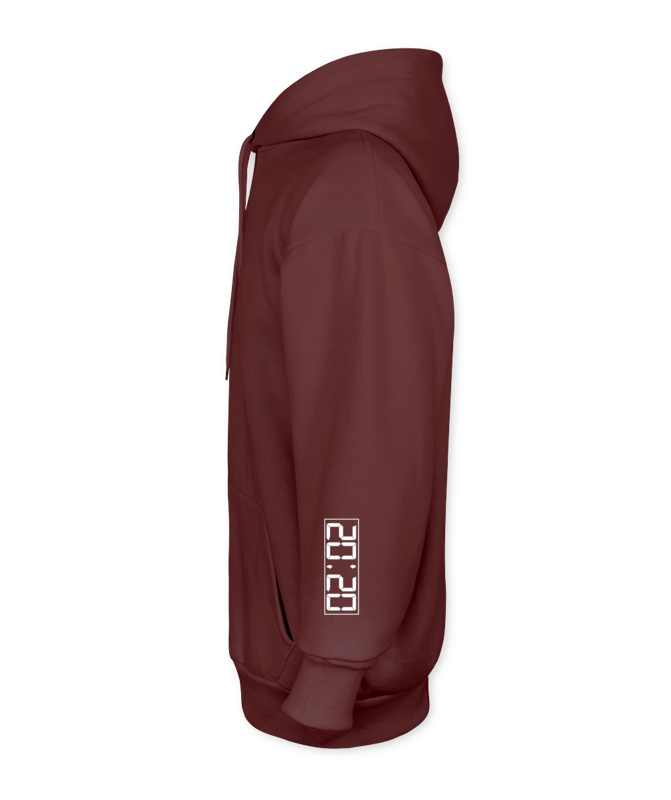 Moletom Canguru 2 Cabos na cor Bordô, com estampa das Horas Iguais, 02:02.