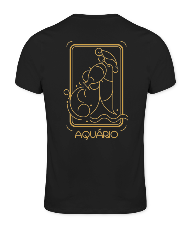 Camiseta Tradicional Premium na cor Preta, com estampa na frente e costas, do Signo de Aquário. Frente 8x8, Costas 30x50.