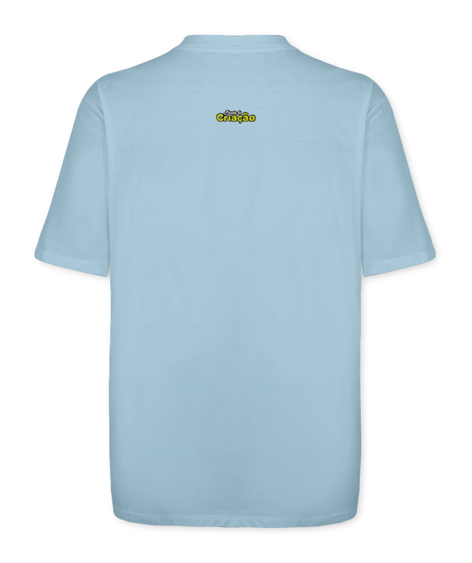 Camiseta Streetwear Oversized na cor Azul Claro, com estampa grande na frente (40x60cm) de um Astronauta, com a Frase: Crie Seu Próprio Mundo!