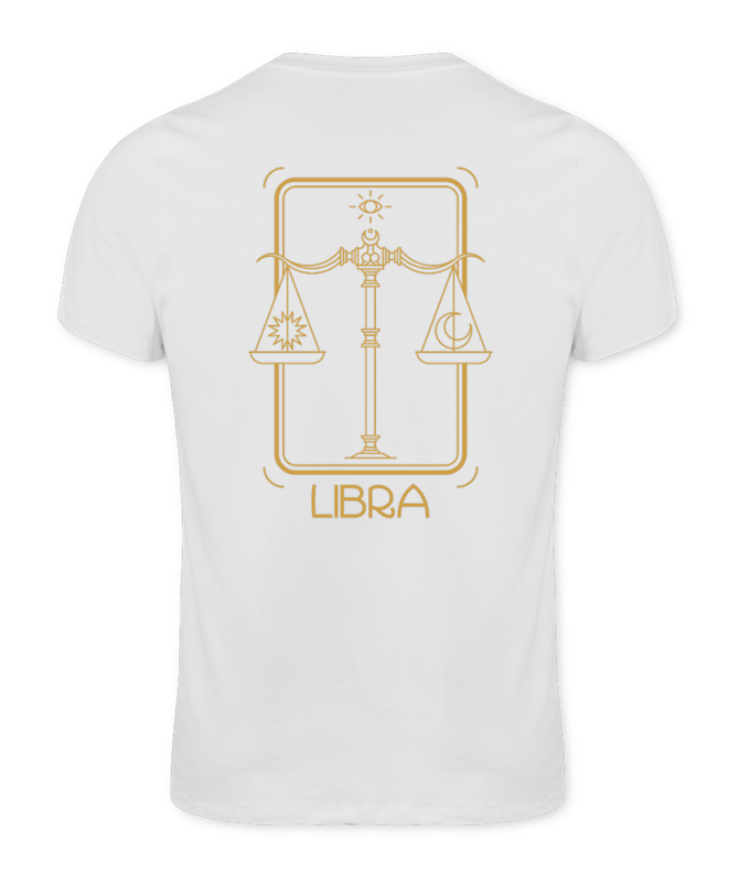Camiseta Tradicional Premium na cor Branca, com estampa na frente e costas, do Signo de Libra. Frente 8x8, Costas 30x50.