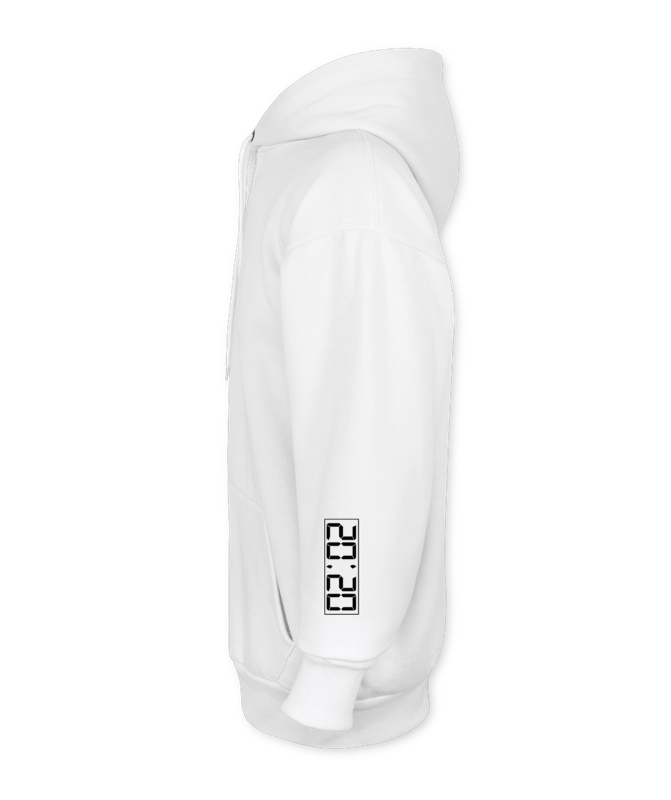 Moletom Canguru 2 Cabos na cor Branca, com estampa das Horas Iguais, 02:02.