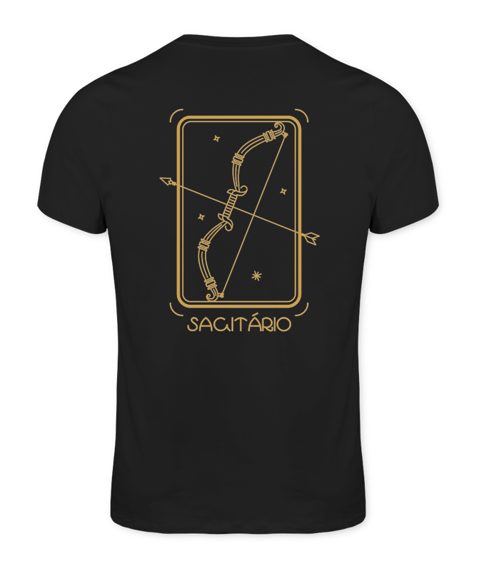 Camiseta Tradicional Premium na cor Preta, com estampa na frente e costas, do Signo de Sagitário. Frente 8x8, Costas 30x50.