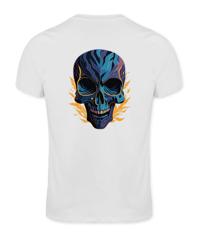 Camiseta Tradicional Premium, na cor Branca, com estampa do IllustraSkull, escrita na frente 8x8, e nas costas 30x50 da caveira grande.