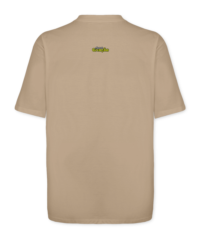 Camiseta Streetwear Oversized na cor Bege, com estampa grande na frente (40x60cm) de um Astronauta, com a Frase: Crie Seu Próprio Mundo!