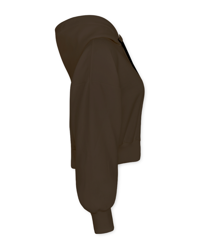 Cropped de Moletom 2 Cabos, na cor Marrom, com estampa na frente das Horas Iguais e também na manga esquerda.