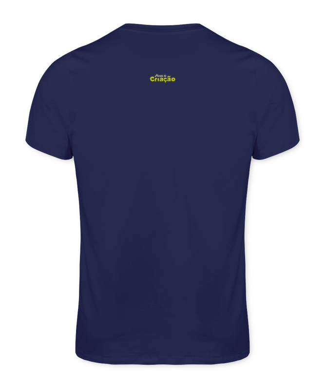 Camiseta Tradicional Premium na cor Azul Marinho, com estampa grande na frente (40x60cm) de um Astronauta, com a Frase: Crie Seu Próprio Mundo!