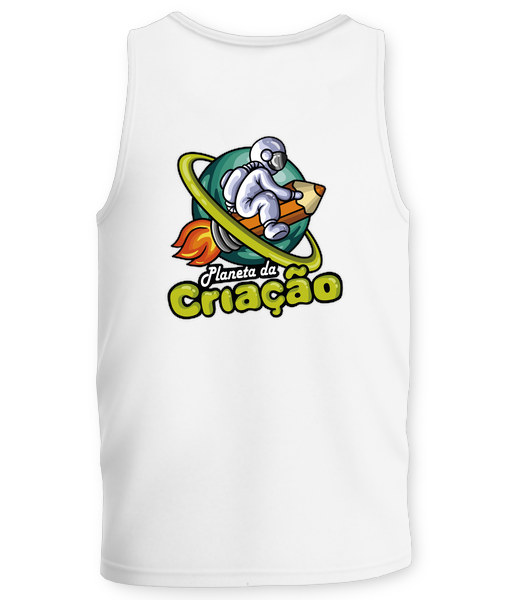 Regata Streetwear, na cor Branca, com estampa do Planeta da Criação grande nas costas.