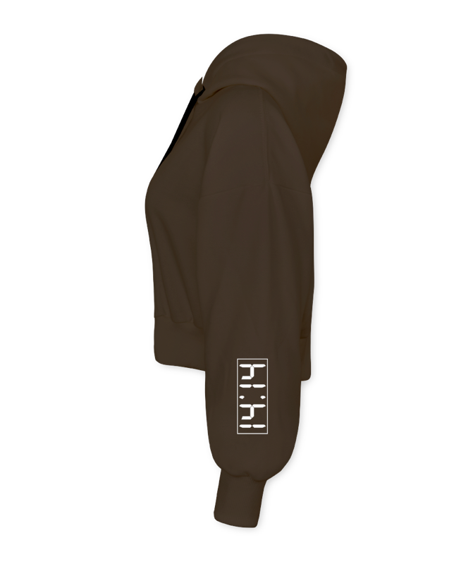 Moletom Cropped na cor Marrom, com estampa na frente 30x21 e na manga das horas iguais, 14:14.