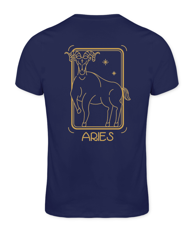 Camiseta Tradicional Premium na cor Azul Marinho, com estampa na frente e costas, do Signo de Áries. Frente 8x8, Costas 30x50.