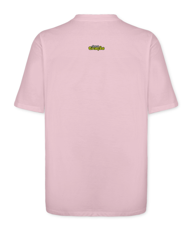Camiseta Streetwear Oversized na cor Rosa Claro, com estampa grande na frente (40x60cm) de um Astronauta, com a Frase: Crie Seu Próprio Mundo!