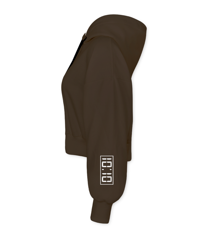 Horas Iguais 01:01 - Marrom - Cropped Moletom estampa na frente e lateral do braço esquerdo.