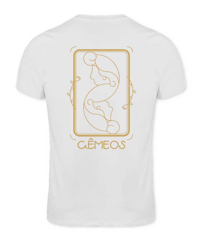 Camiseta Tradicional Premium na cor Branca, com estampa na frente e costas do Signo de Gêmeos. Frente 8x8, costas 30x50.