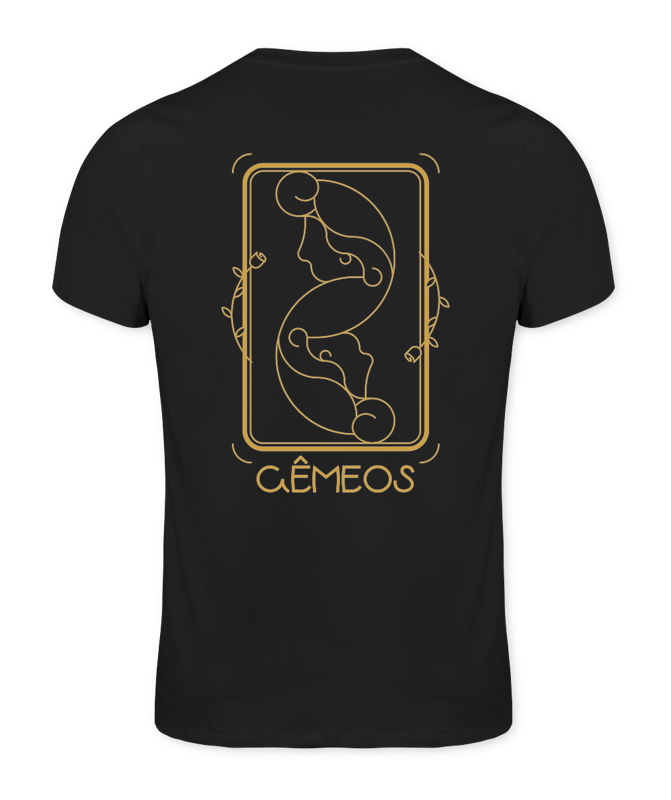 Camiseta Tradicional Premium na cor Preta, com estampa na frente e costas do Signo de Gêmeos. Frente 8x8, costas 30x50.