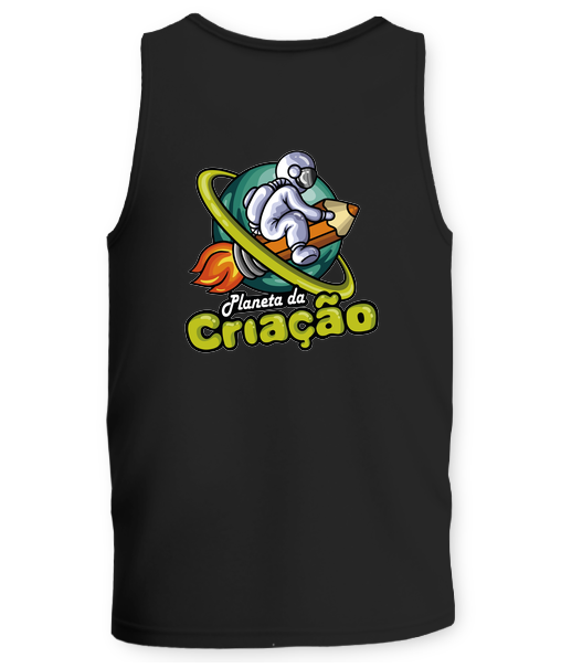Regata Streetwear, na cor Preta, com estampa do Planeta da Criação grande nas costas.