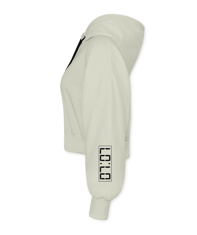 Cropped de Moletom 2 Cabos, na cor Off-White, com estampa na frente das Horas Iguais e também na manga esquerda.