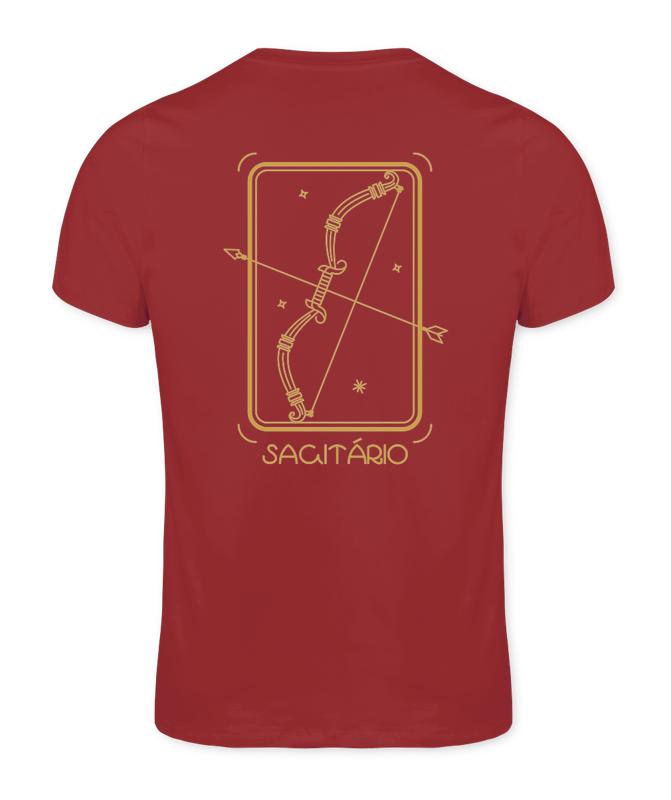 Camiseta Tradicional Premium na cor Vermelha, com estampa na frente e costas, do Signo de Sagitário. Frente 8x8, Costas 30x50.