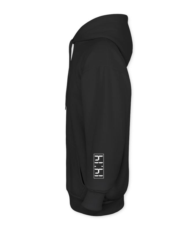 Moletom Canguru 2 Cabos na cor Preta, com estampa na frente 30x20 e estampa na manga esquerda, das horas iguais, 14:14.