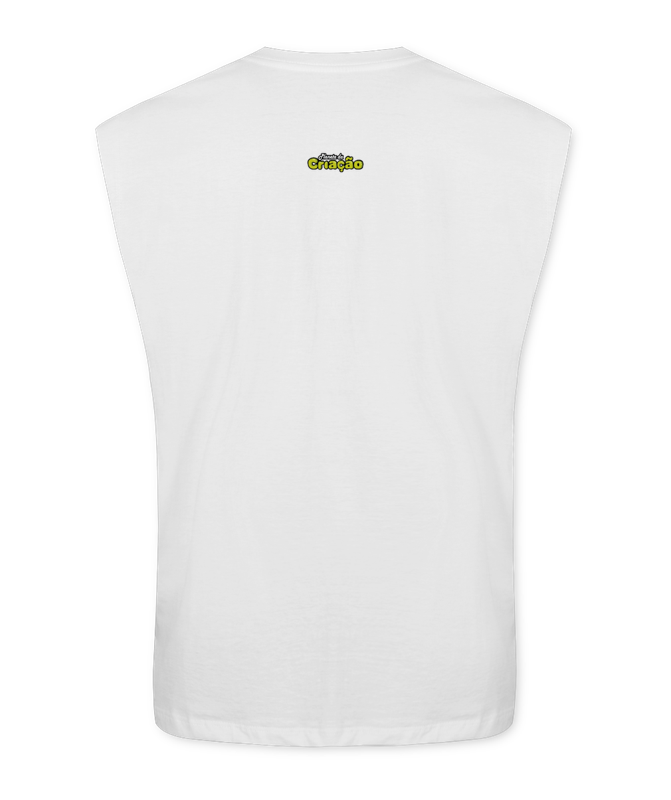 Regata Básica Machão na cor Branca, com estampa grande na frente (40x60cm) de um Astronauta, com a Frase: Crie Seu Próprio Mundo!