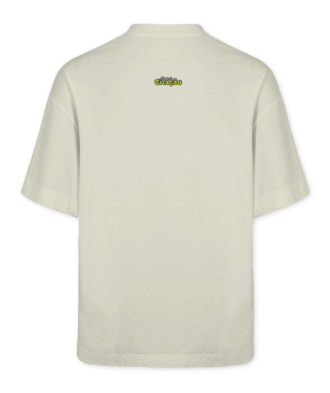 Camiseta Streetwear Tubular na cor Off-White, com estampa grande na frente (40x60cm) de um Astronauta, com a Frase: Crie Seu Próprio Mundo!