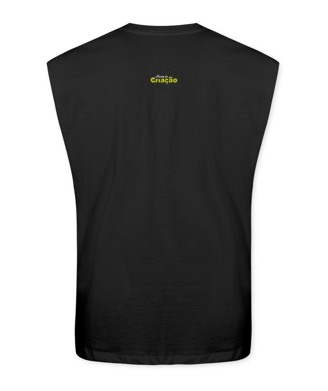 Regata Básica Machão, na cor Preta, com estampa do Planeta da Criação grande na frente.